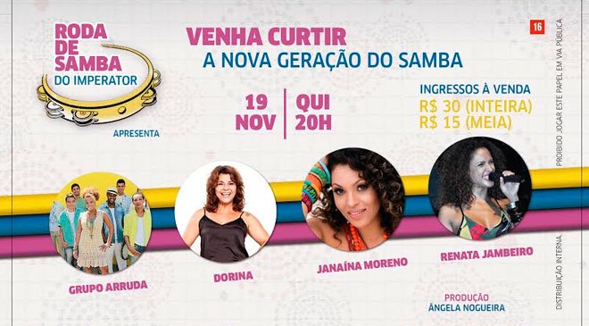 Para esta roda de samba o projeto traz, a representatividade e importância da mulher no samba, com a já consagrada sambista Dorina e duas jovens e talentosas revelações do samba que são: Janaína Moreno e Renata Jambeiro. Além é claro da participação fundamental do Grupo Arruda, no comando da roda e conta em sua formação, com a voz feminina da talentosíssima Maria Menezes.